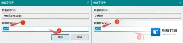 分别Default选项和InstallLanguag选项,然后在弹出的窗口中,将它的数值数据修改为0804,默认的是0409,然后单击确定按钮进行保存,最后重启电脑,也是可以解决问题的。