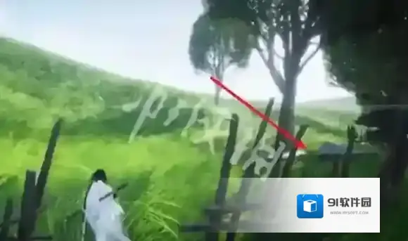 2、到达后,转动视角,去箭头处的棚子上面,有个猫戏。