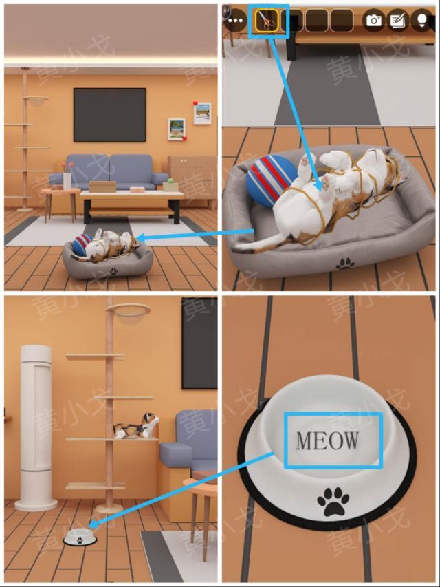 28.点击猫,用剪刀剪开它身上的绳子;猫去吃猫粮,查看猫碗,获得线索