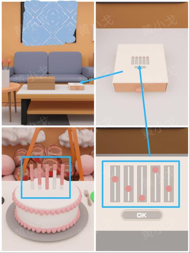 16.点击桌子上的白色盒子,根据[派对]场景蛋糕上的蜡烛线索,调整密码锁
