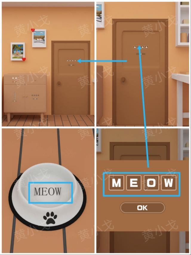 29.点击门上的密码锁,根据猫碗中的单词,输入密码:MEOW,打开门