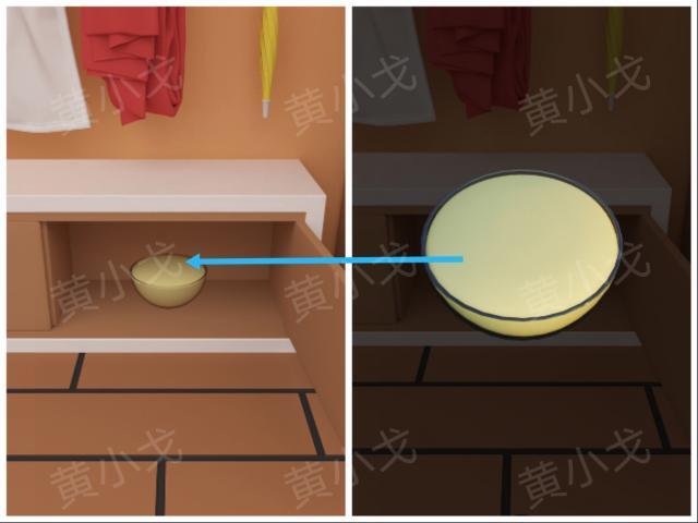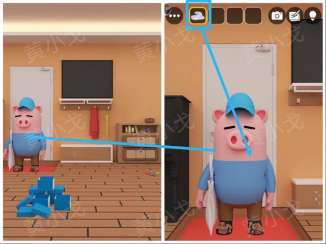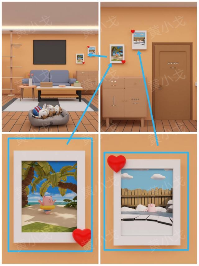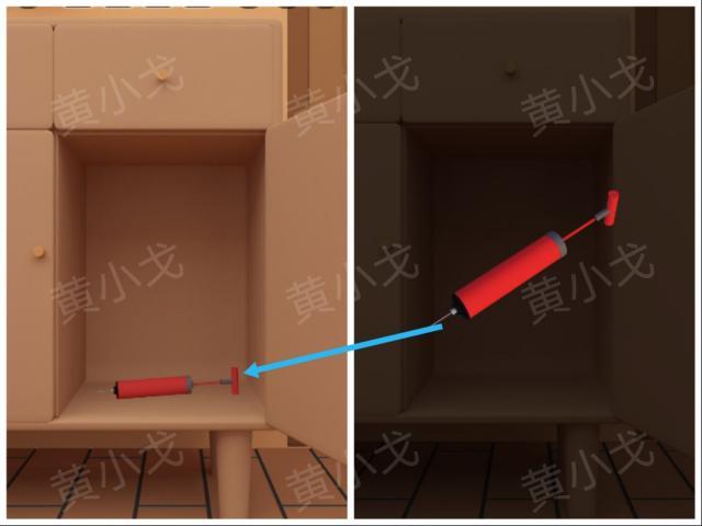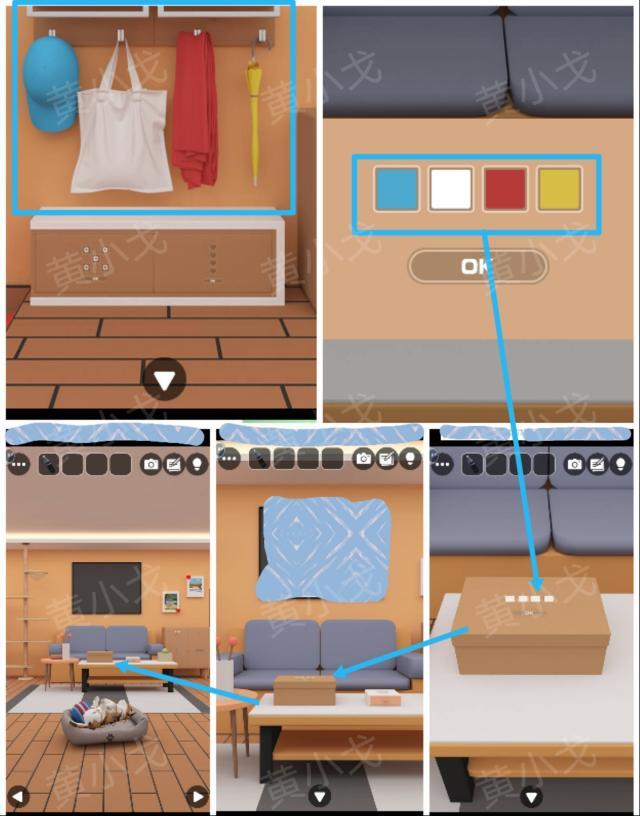 11.点击桌子上的纸盒,根据[玄关]场景挂钩上的物品颜色线索,调整密码锁