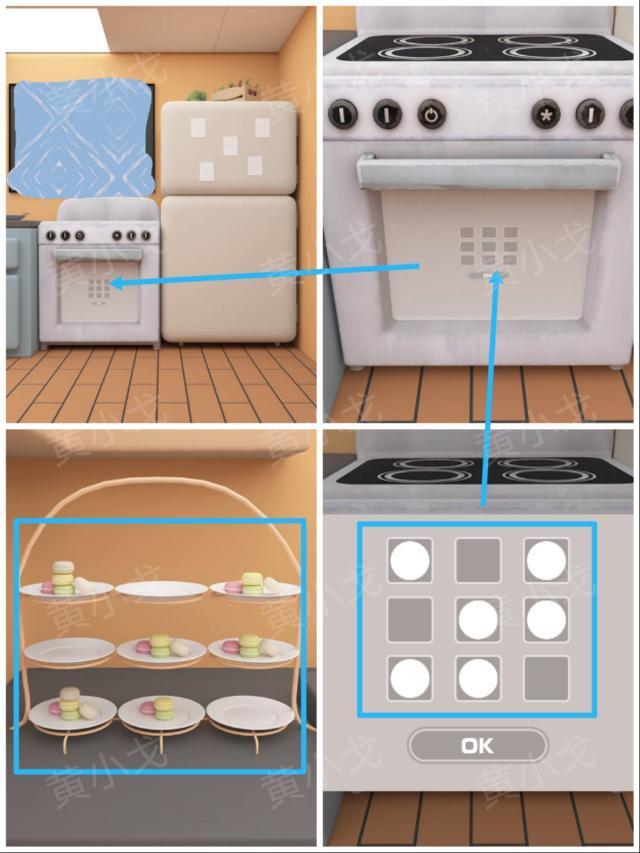 20.点击烤箱上的密码锁,根据点心架上装有马卡龙的盘子的位置线索,调整密码锁