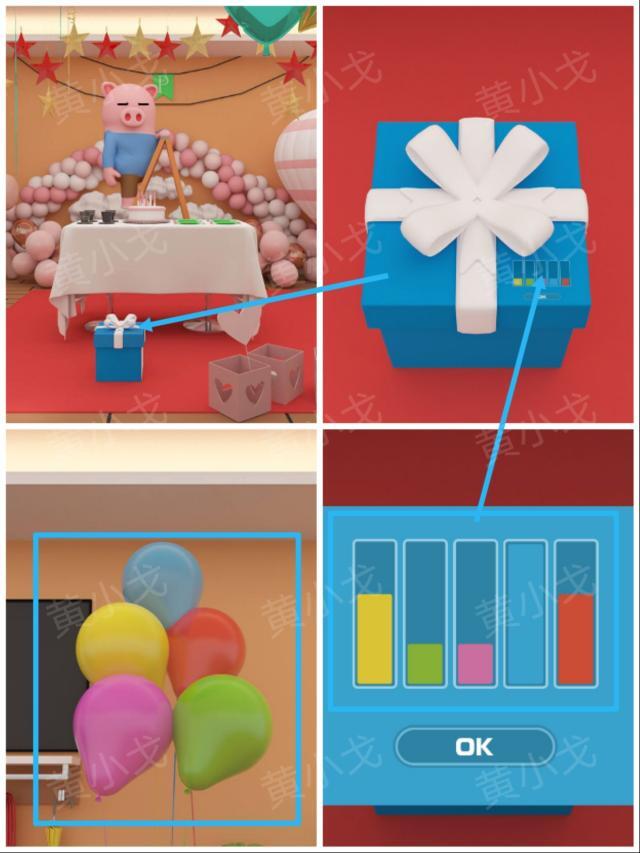 26.点击地上的礼物盒,根据上面的颜色提示,结合[玄关]场景企鹅打好的气球颜色及高度线索,调整密码锁
