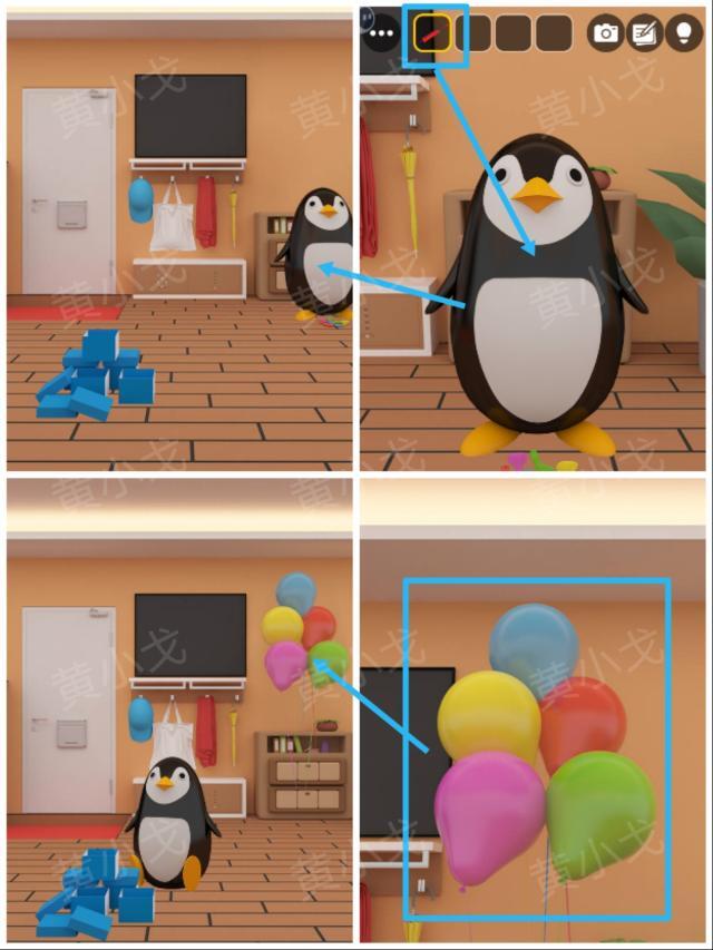 25.点击企鹅,拿打气筒给它;查看它打好的气球,获得线索