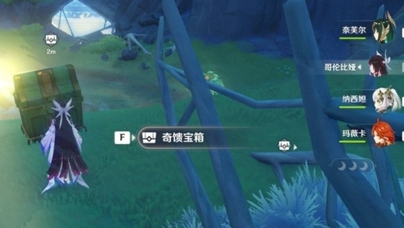 在此处接近月灵使其跟随,出现并收集所有月之微粒出现奇馈宝箱