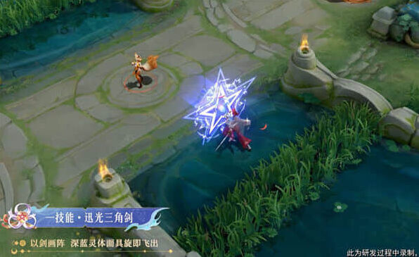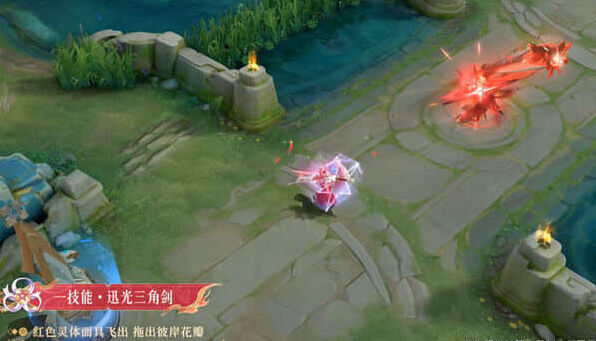 以剑画阵,深蓝灵体面具旋即飞出。红色灵体面具飞出,拖出彼岸花瓣。普通形态就是夏洛特推出一个蓝色的灵体面具。击中敌人后,夏洛特加速走的时候,都是带着拖尾特效。一技能的强化形态特效,也是扔出面具,但是强化后推出的就是红色面具了。