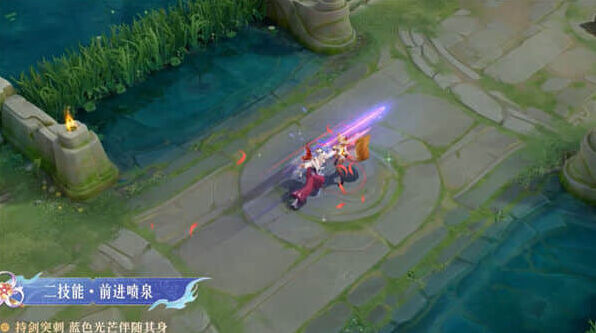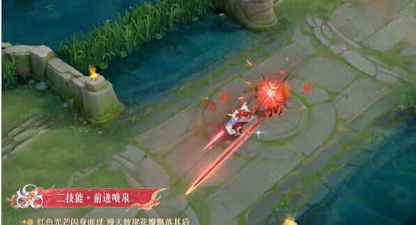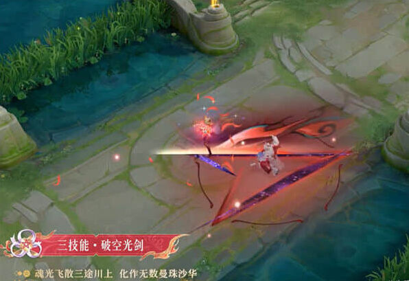 持剑突刺,蓝色光芒伴随其身。红色光芒闪身而过,漫天彼岸花瓣飘落其后。普通形态特效是夏洛特突刺,身边是有蓝色的光芒。二技能强化形态下,依旧是特效变成了红色,而这次突刺之后,身边就会有彼岸花的花瓣飘落了。