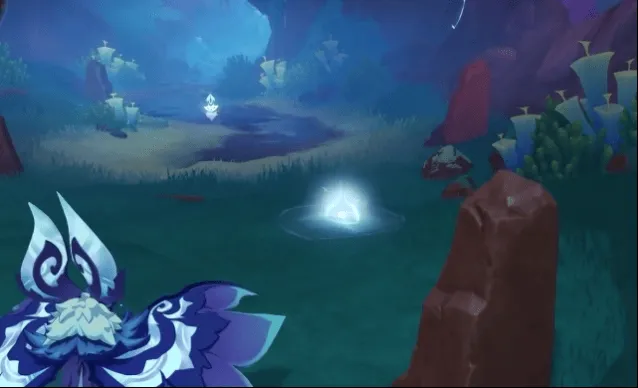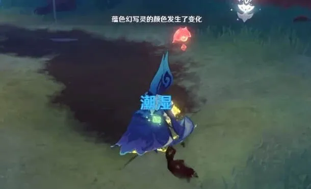 进洞后可以看到前方地面上有光点,保持暝视龙变身状态站上去(要对准),开启元素视野后即可发现隐藏的染料(派蒙说话说明成功了)
