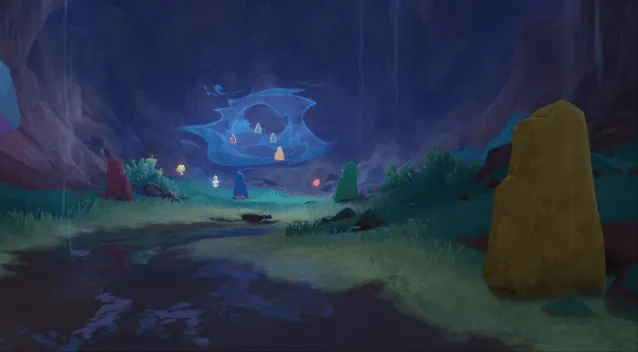 回到荧草窟,也就是之前捡染料的地方,可以看到壁画上果实没有颜色,依照洞穴中吊着的三种果实,拾取对应的颜色丢上去(颜色顺序如图,黄蓝红),即可开门