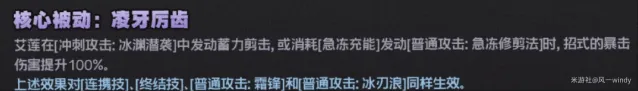 最后是艾莲在数值方面的提升,此前艾莲的核心被动只能为蓄力剪击和冰附魔普攻施加100%暴伤加成,而在增强过后,艾莲的核心被动还能对连携技、终结技以及普攻的[霜锋]和[冰刃浪]生效,大幅提高了核心被动的覆盖率,强化明显。