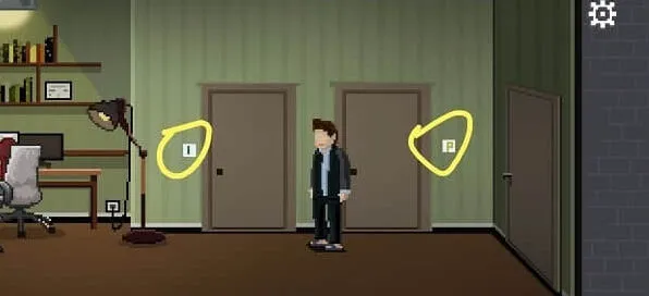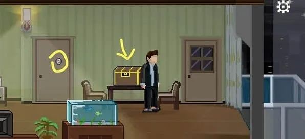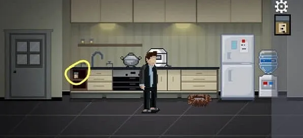 按一下墙上的白色机关,上面有一排按钮,下面有四个提示,按提示把上面四个柜子的把手都转到左边,会掉落钥匙。点击妻子,提示凶手在右边,好的继续往右走。