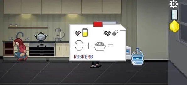 点击两次,拾取两袋泰国香米,把一袋放进电饭煲焖成米饭,另一半喂给鸡,拾取鸡蛋,鸡蛋放进炒锅。冰箱上写的条是鸡蛋+米饭,把米饭也放入炒锅,给妻子吃蛋炒饭。
