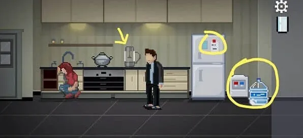 打开冰箱下层获得一个柠檬;点击水桶装饮水机,根据冰箱上贴的纸条提示的红蓝点击水龙头,打开后即可用玻璃杯装水。把柠檬和水分别装入榨汁机,拾取柠檬汁喂给妻子。