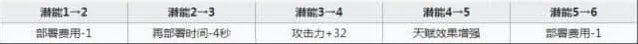 破片杀伤:攻击范围内每存在一个敌人,自身攻击力+4%,最多叠加5次(6次)(精英二满潜能时数据,括号内为潜能加成)。