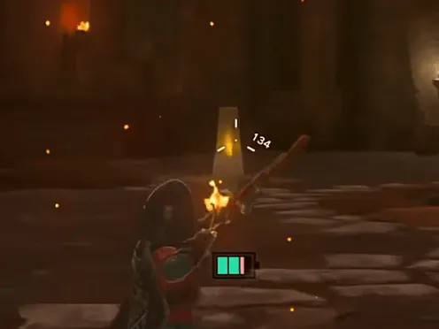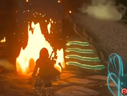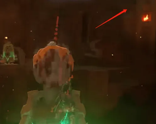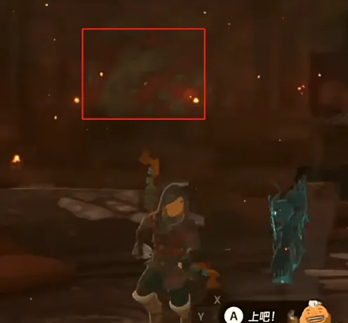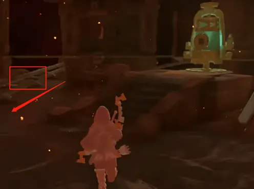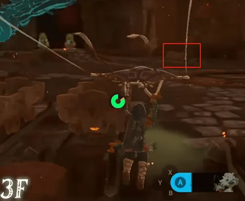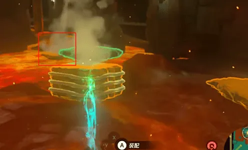 2、我们可以用木柴捆加海拉鲁球果(助燃),生成上升气流,然后飞到刚刚红色岩石的位置,往下回到一楼。
