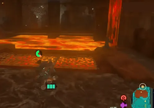 1、进入神殿后,直接往右边走,跳过岩浆后,用放水栓、余料建造粘合放水装备或者用水之果都可以在前面的岩浆上制造空地,到达对岸。