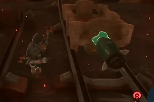 3、矿车停了之后下车往左走,攻击机关,放下轨道。然后把旁边地上的矿车放在轨道上,开启矿车上二楼。