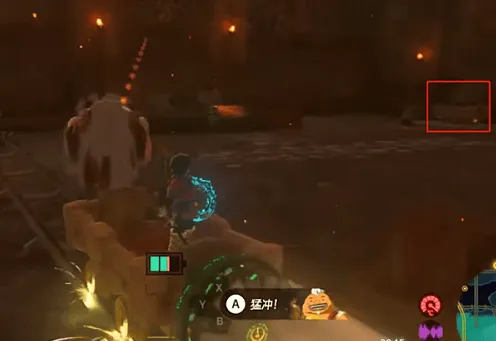1、原路返回矿车附近,用弓箭+火焰果开启机关,然后启动矿车,路上有岩石就用阿沅的技能撞碎。