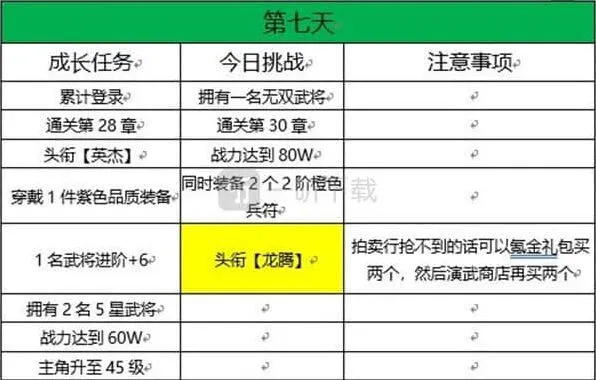 6:前七天先尽量均衡发展,七天后再走极限,方便完成任务(武将进阶及装备品质)