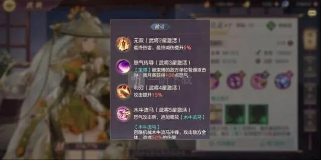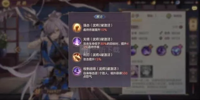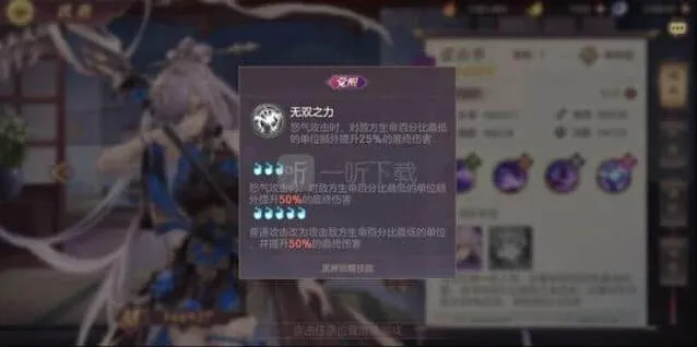 无双后的被动分为两块:一个是怒攻对地方血量最低单位造成50%最终增伤,一个是普攻攻击敌方血量最低单位,并提升50%最终伤害,需要注意的是,这两个最终伤害与3星被动是可以完美叠加的,再配合她的杀人回怒,就是一台人肉收割机!