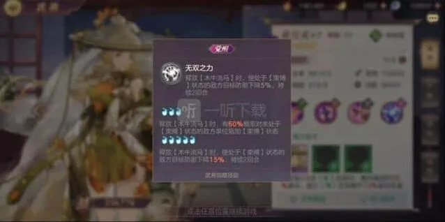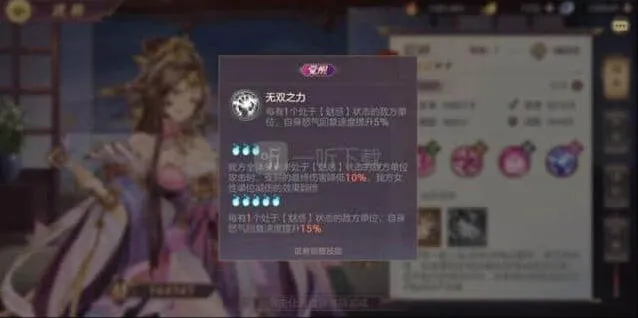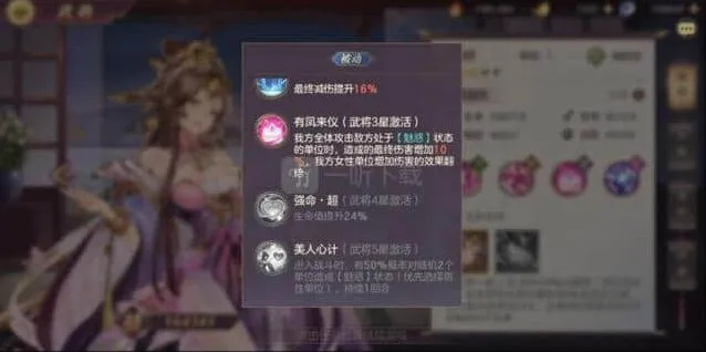 整体拥有+15%对男性防御,+20%免伤,+2回合20%暴击率的buff,同时对被魅惑单位有额外20%的伤害加成。