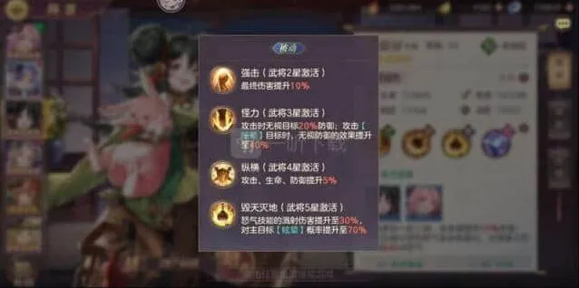 关银屏:爆裂冲击(提高伤害)/破釜沉舟(提高存活及攻击),一般3火前使用破釜沉舟,3火时候两者差不多,5火后爆裂冲击伤害更高,破釜沉舟能多挺一会。