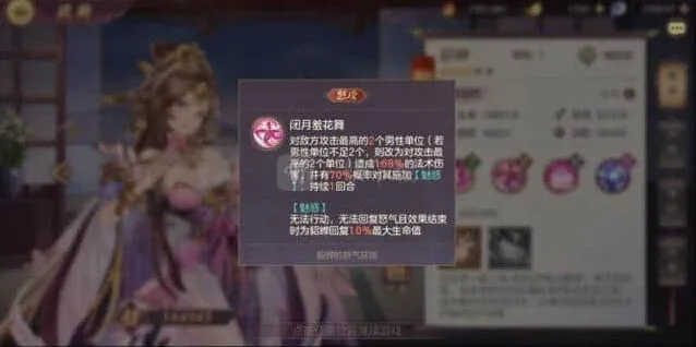 首先是她的怒气攻击:魅惑敌方攻击最高的2个男性,如果不足两个2人则改为魅惑攻击力最高的武将。
