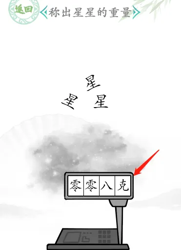 首先本关卡并不是要求称出星星的重量,而是要利用谐音梗找出星巴克就可以过关了,开局先点击八下第三个零,这样就会变成数字八。然后再点击最右边的吨就会变成克,这样电子秤上面就会显示八克,最后将星字放到秤上就会称出星八克。