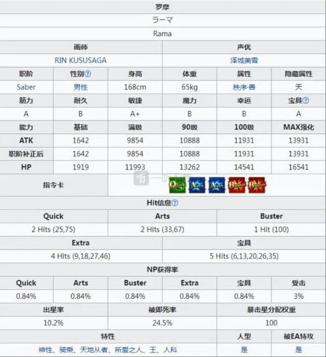那么从面板来看,其实罗摩的攻击力在四星当中还算是不错的了,至于np率的话,还是早期大多数从者的老毛病,蓝卡还算是卡在了平均线上,但是也不算出色,至于绿卡就不用指望了,不论是打星还是打np都是偏弱的。