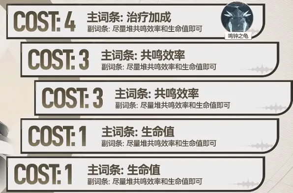声骸主词条方面,cost4选择治疗加成,cost3选择共鸣效率,cost1选择生命值。