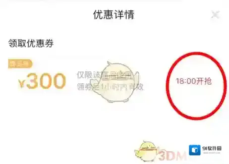 4、上面很显眼的提示18:00开抢,大家在规定的时间蹲守就可以了,说实话这个券不是那么的好抢的哈。