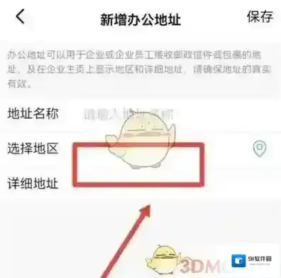 7、最后在进入的页面里根据提示输入办公地址名称、详细地址等,完成后点击右上方的“保存”按钮即可。