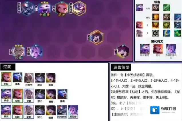 牌浪在这套阵容里的应用:7级找到两星纳尔之后,先存钱别搜牌,纳尔嫖的好,再去搜,嫖不好,先上8级。
