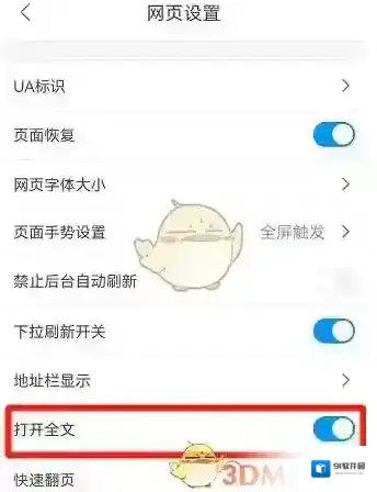 4、进入网页设置页面里,将打开全文后面的开关开启即可,如下图所示。