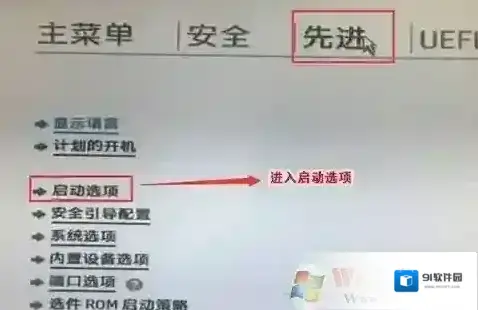 5、F10保存重启后再次开机按ESC,然后选择F10进入BIOS设置,将鼠标移动“先进”选项中,选择”启动选项”后回车进入,如下图所示;