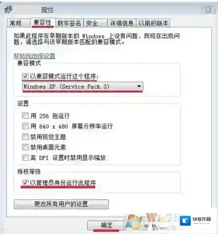 win7系统下应用程序打不开的解决方法2、在“属性”窗口,我们点击:兼容性,然后,在“以兼容模式运行这个程序”前打勾,并选择WindowsXP(Service Pack3),再在“以管理员身份运行此程序”前面打勾,最后点击:确定。