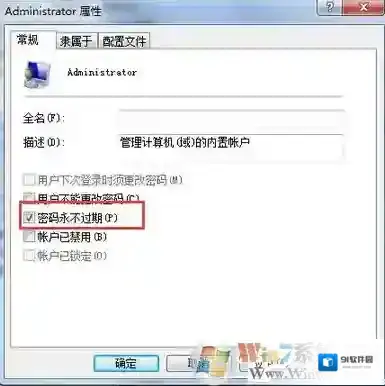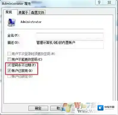 4、右键:Administrator – 属性,在弹出的“Administrator属性”窗口,找到“账户已禁用(B)”,我们看到:账户已禁用(B)前面有勾,左键点击:账户已禁用(B),取消前面的勾,再点:确定。