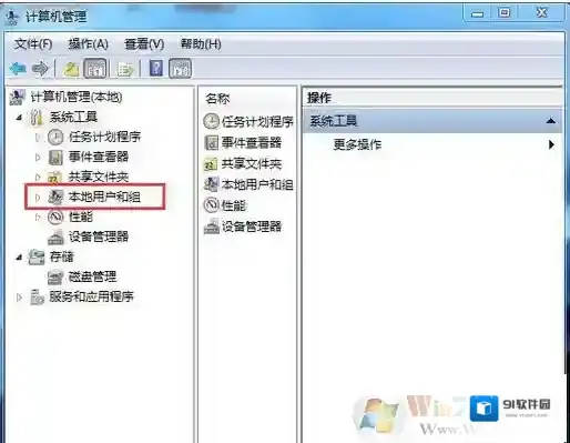 2、在“系统工具”的展开项中找到:本地用户和组,并点击:本地用户和组前面的小三角;