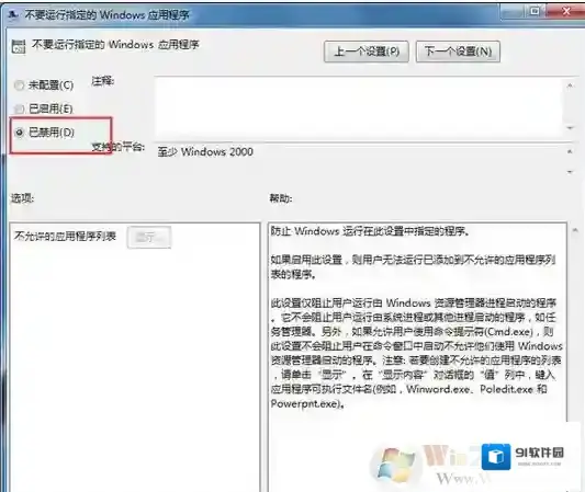 、win7系统下应用程序打不开的解决方法6、用鼠标左键双击:不要运行指定的Windows应用程序,在弹出的“不要运行指定的Windows应用程序”窗口,点:已禁用,再点:确定,退出“本地组策略编辑器”。