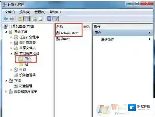 3、我们点击“本地用户和组”展开项中的:用户,在窗口右边列出的帐号中,找到:Administrator;