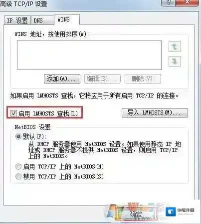 4、此时我们进入高级对话框,点击选择上方Win标签,将启用LMHOSTS前面的对号给去掉,如图: