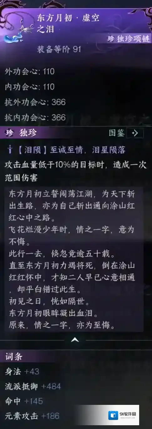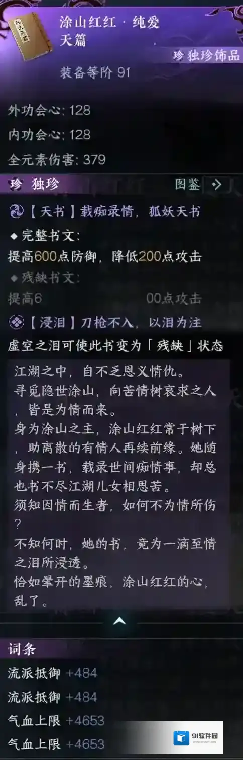 若是将象征至情之物的东方月初·虚空之泪与苦情树花进行加工,便可制作成独珍装备涂山红红·纯爱天篇。在《狐妖小红娘》的故事中,此书本身刀枪不入,但曾被虚空之泪切割从而使书文断层。在逆水寒里,虚空之泪同样会对其产生影响。在受到携带虚空之泪玩家的伤害后,纯爱天篇的书文便会变得“残缺”,带来全新的属性!
