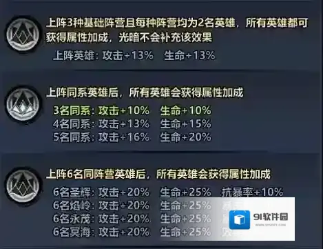 当上阵的英雄为同系英雄时,相同羁绊英雄之间将会获得额外属性加成效果。随着同系英雄的上阵人数增加,相关英雄所获得的羁绊属性加成也会随着提升。