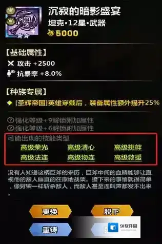 2、装备技能在装备强化至+12后会在以下装备技能中随机获得1个