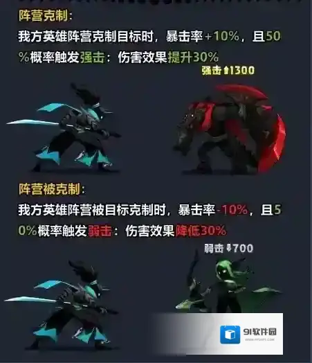 当我方英雄阵营克制目标时,将会提高暴击、触发强击以及提升伤害,反之,若被克制时,将会减少暴击、触发弱击以及降低伤害。