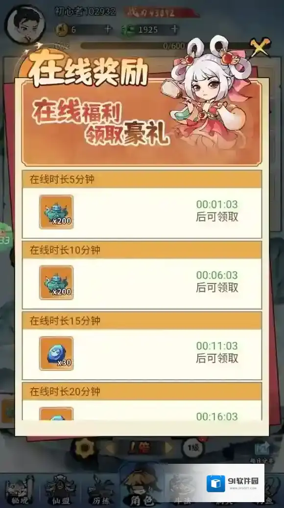 5、每天在线一定时常可领取在线奖励。