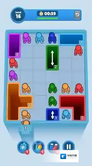 2、每关都会有不同颜色的小人需要进入对应的洞口,每个洞口可以进入的小人数量是有限的。