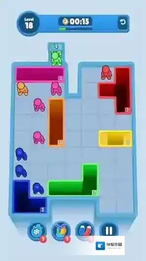 游戏的玩法比较简单,通过移动关卡里的方块让对应颜色的小人进入洞口就可以通关。在关卡里只有对应颜色的小人才可以进入洞口,而且不同颜色的方块和小人是无法穿过去的,移动各种颜色的方块来寻找合适的途径,将所有的小人全部送入洞口来体验最有趣的闯关过程。