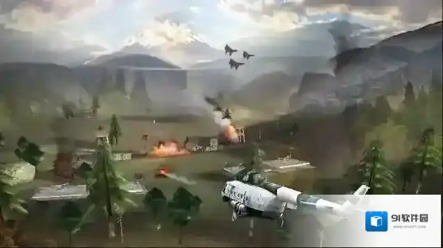 3、战斗场景,操控直升机,在陆海空战场,射击敌方战机、摧毁地面目标,完成消灭敌人任务,展现空战玩法,画面有爆炸、战机缠斗特效。